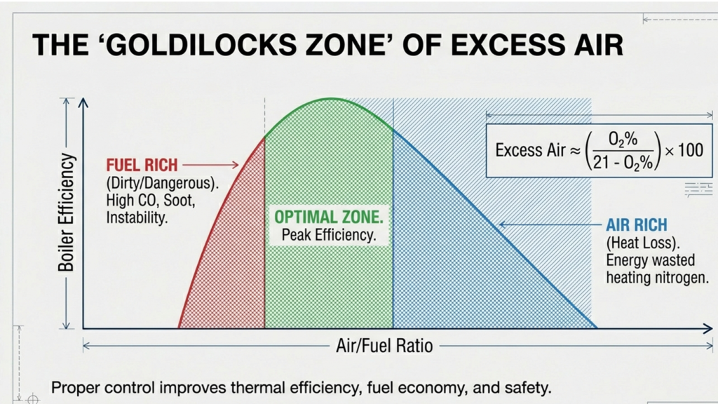 The single most important field-measurement for combustion efficiency is the flue gas oxygen concentration. Excess air percentage is derived directly from measured O₂ using the modified Ostwald formula: